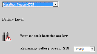 M705 是定位在能夠長效使用的多用途無線滑鼠,其產品名稱可是 Marathon Mouse (馬拉松) 呢,主打的特色就是長達三年的電池壽命。不同於 VX Revolution 的單三號電池室,M705 的電池室可以塞入兩顆 3 號電池,但有趣的是只放一顆也能正常驅動,而且重量較輕。我把原本 VX Revolution 用了一半的 Eneloop 低放電池塞進去,顯示為低電量,但可用天數居然還高達 218 天。不曉得放兩顆充飽的低自放可以用多久..... 原廠宣稱可以用三年!